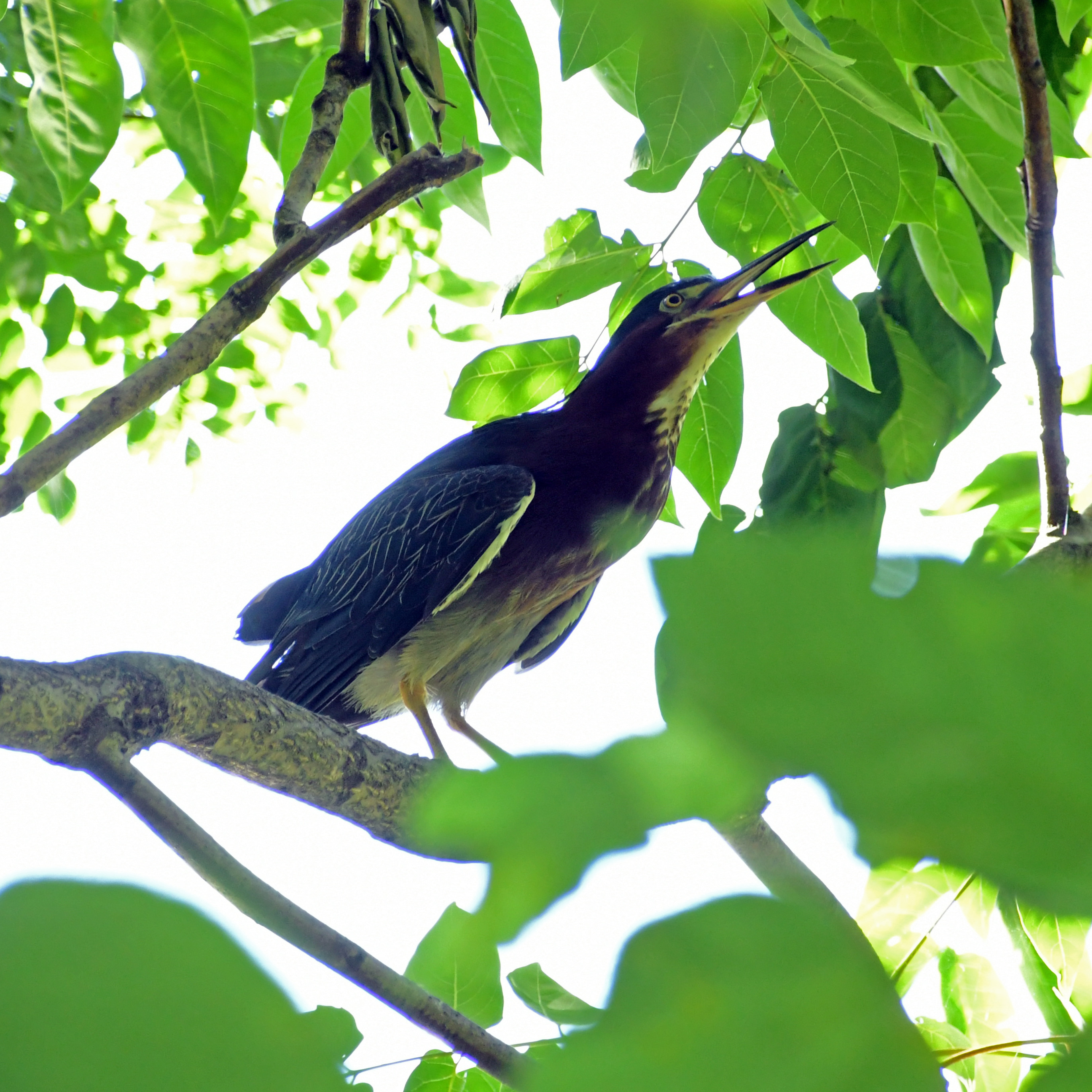 Last week a fellow birder showed me photos that he had taken of green heron chicks in a nest. He told me where the nest was, roughly, but I wasn’t able to find it that day. This morning, a fellow dog walker who knows I take bird pictures flagged me down to tell me she had seen the nest, too, and explained the location a little more clearly. But once I got to the spot, all I could find was a paper wasps’ nest, busy with traffic. (Another kind of wasp, Eastern cicada killers, were out in a field in large numbers, busy not with a nest but with one another; maybe they were mating?) At last I did see a green heron, preening herself, in a tree between the path where I was standing and the water’s edge. “What a beautiful dog,” a man in a cap said, of Toby, who was waiting patiently, looped to a fence post, and after petting Toby, he joined me in trying to photograph the heron. After he left, a few bird photographers with professional tripods and lenses walked by. I asked one if he knew where the nest was; he admitted that there was one, but would only say that it was “around here,” and then added that the heron had flown away, in a tone that sounded meant to be discouraging. I kept looking. Finally another dog walker saw me peering into the trees, asked if I was looking for the heron’s nest, and pointed it out to me—a darkened smudge fairly high up.