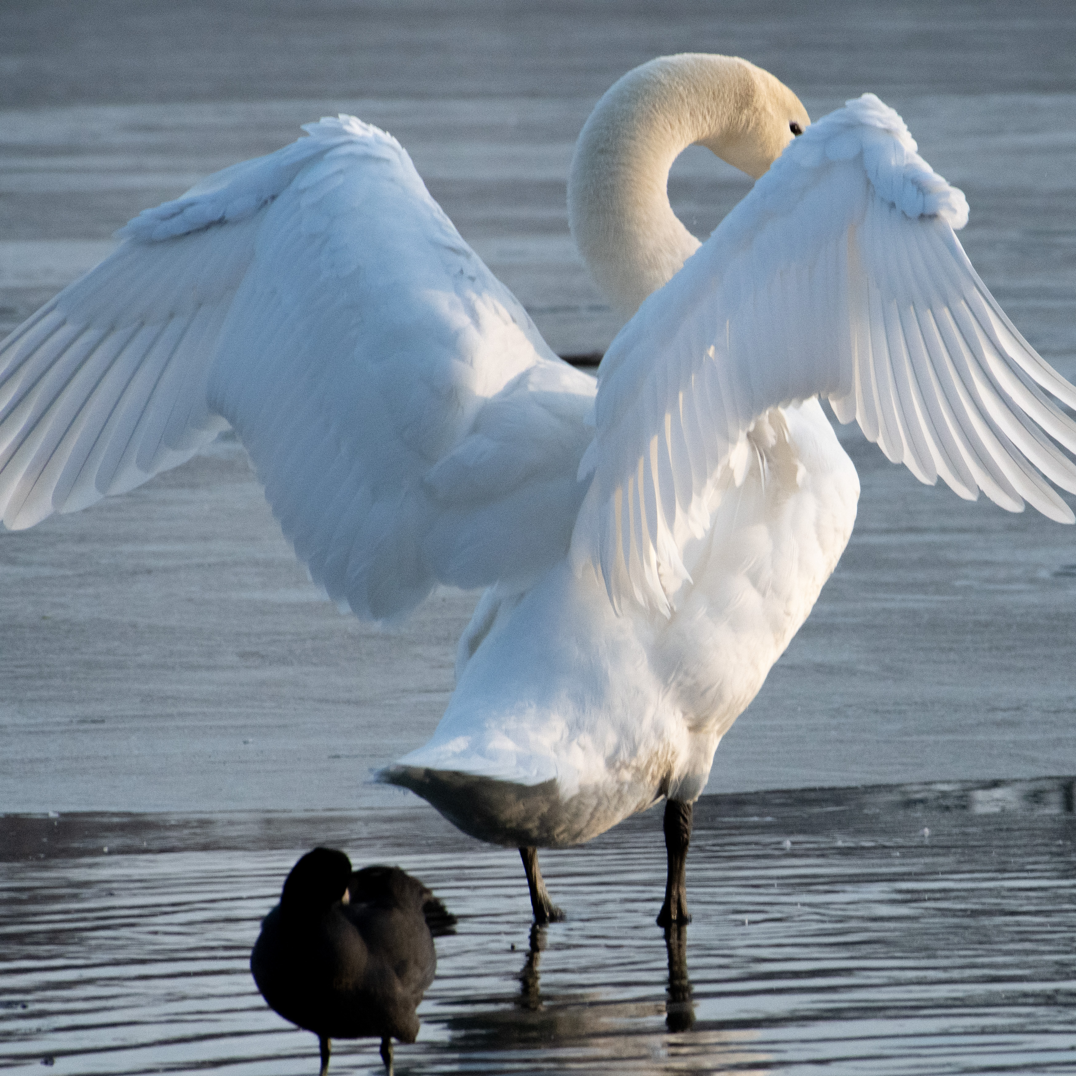 There was a Carolina wren high in a tree, singing its heart out to welcome the sunrise, but too high for me to get a picture worth posting. It was easy to get close to the mallards, on the other hand, because they were preoccupied with getting all chesty with each other.
