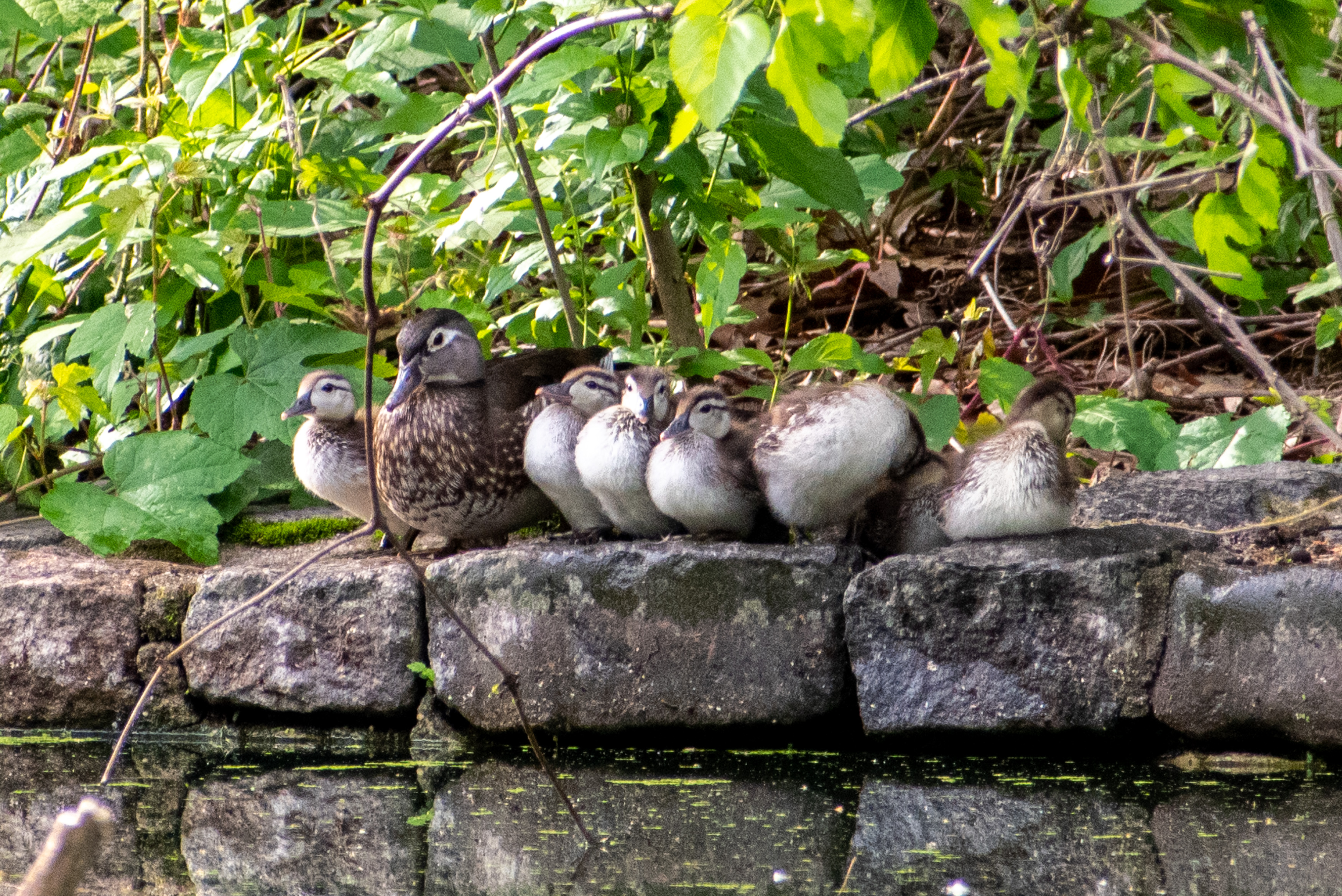 There are multiple reports of a wood duck hen in the park who’s supervising nineteen ducklings this year, but so far I’ve only seen this hen, who’s in charge of a more modest quota of seven (only six are countable in the lower photo, but there are seven).