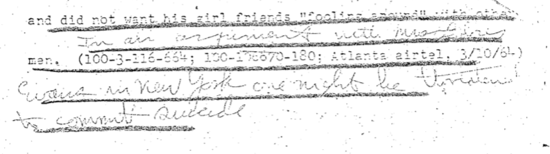 In this screenshot, taken from page 16, the handwritten portion reads, “In an argument with Mrs Dolores Evans in New York one night he threatened to commit suicide.” For reference’s sake, let’s name the author of these cursive annotations Loopy.