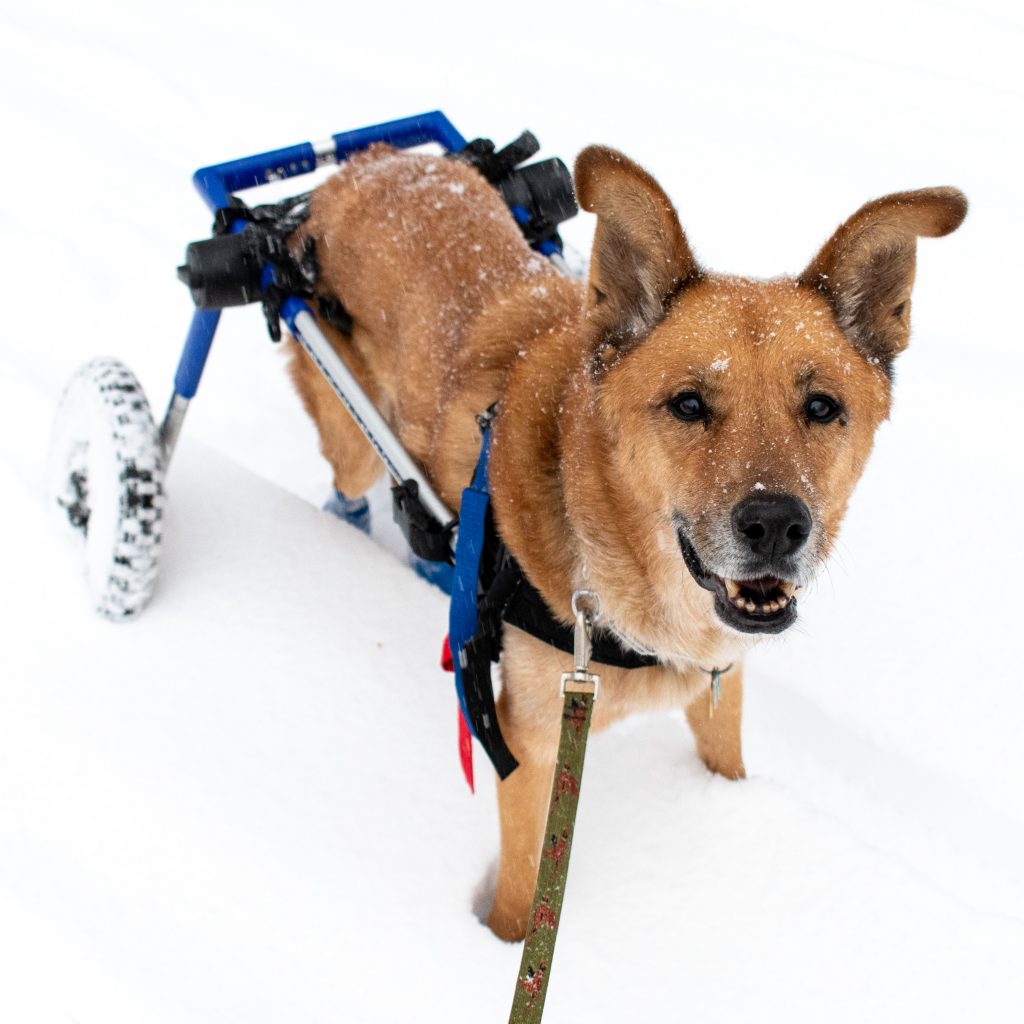 In July 2018, he tumbled while running after a toy and cried, unable to get up. I carried him home, almost a mile. A frankly incompetent vet insisted that one of his hip bones had come out of its socket, even though she took two X-rays that showed the hip bone in place. A day and a thousand dollars later, a vet at a second clinic advised that his hip was fine, but that his gait was “ataxic,” that is, uncoordinated, probably, in her opinion, because he had canine degenerative myelopathy, a progressive form of paralysis, similar to ALS in humans, that begins with the extremities and is not only incurable but untreatable. After diagnosis, time to death is typically between six months and three years. It is a cruel disease, because the dogs remain very much themselves, and in Toby’s case, in cheerful spirits, even as they lose sensation in, and command over, their bodies.