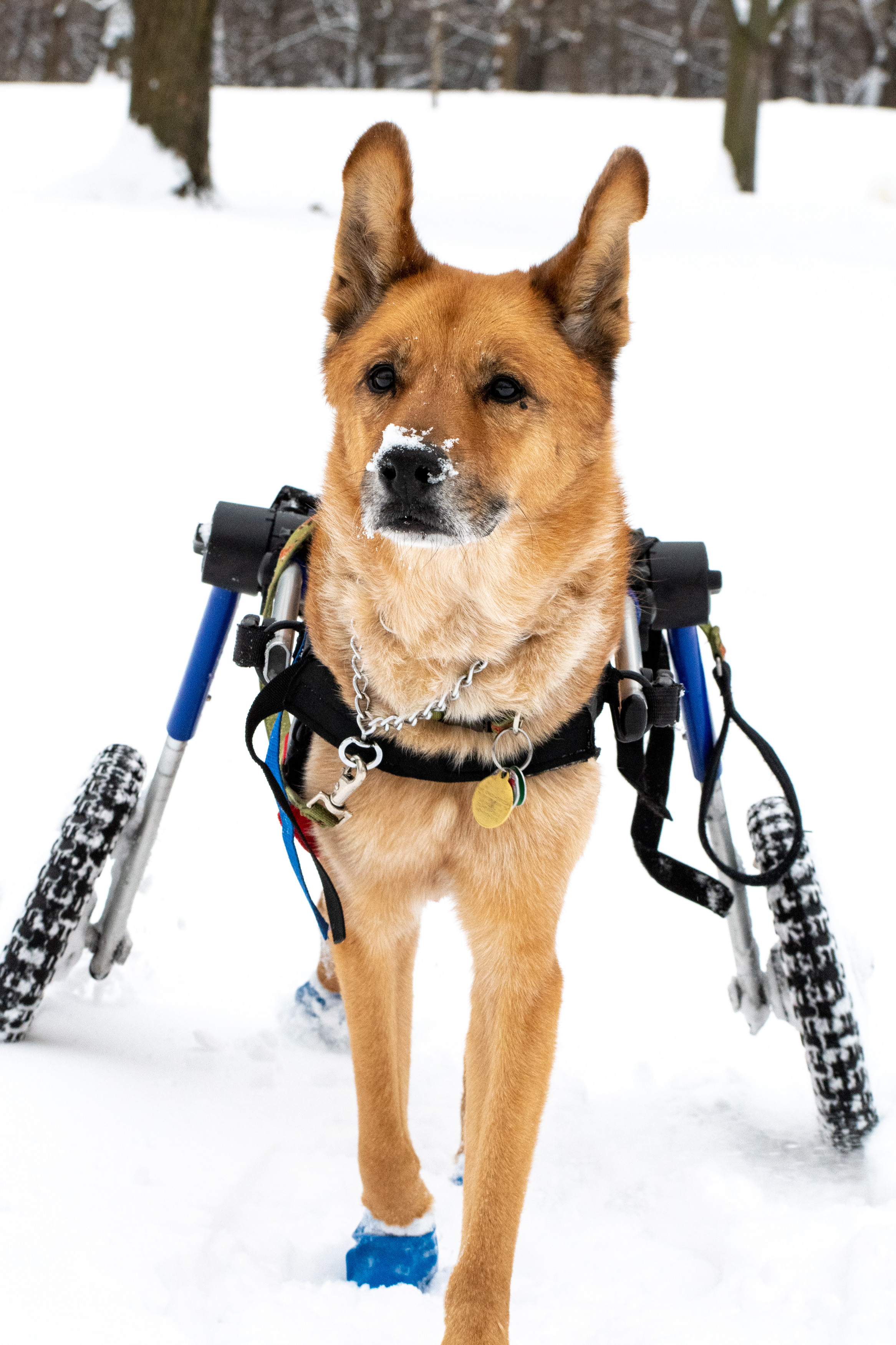 We supported his back legs with a sling for several months, and the sprained muscles in his back legs healed almost completely. He wobbled, but he was able to walk on his own again. After a while he stopped being able to raise his tail, however, and some time after that, he stopped being able to wag it. He started to drag his back paws, which we protected with Pawz rubber booties, which are ordinarily used to protect dogs’ paws from the salt that’s put down to de-ice roads in winter. In late spring 2020, we began to support his walking with a Help-‘Em-Up harness. Sometimes we were able to take it off, though, and get by without it. His bark started to become higher in pitch. He started having accidents in the house, which we minimized by doing some arithmetic and, after some experimentation, setting up a new schedule for mealtimes and walk times, which we had to keep to rigidly, and even then didn’t always work. A blood test in September 2020 showed anomalies, suggestive of something new wrong inside, that we decided it didn’t make sense to investigate. In December 2020, the owner of Slope Cellars, a wine store in Park Slope, recognized Toby’s gait as characteristic of the illness and hailed Peter and offered to donate a Walkin’ Wheels dog wheelchair that a dog of hers with the same illness had used. He tore around our apartment with it as soon as we rigged him into it, and until his last day he went on two long walks in the park with it every day. Almost all the bird and nature photos on this blog were taken in his company. About a week ago he became sick, in a way that didn’t respond to the usual home and over-the-counter remedies but only got worse, and after a lot of agony, we decided it was time. After his last walk in the park, on Wednesday afternoon, while I was waiting on the sidewalk with Toby for Peter to pick us up in our car, a dozen schoolchildren came up and asked to pet him, and he licked their fingers while they stroked his head and told me about the dogs and cats they knew and had known. “I like that dog,” one of the little girls said, in a tone of voice suggesting that not all dogs met her standards.