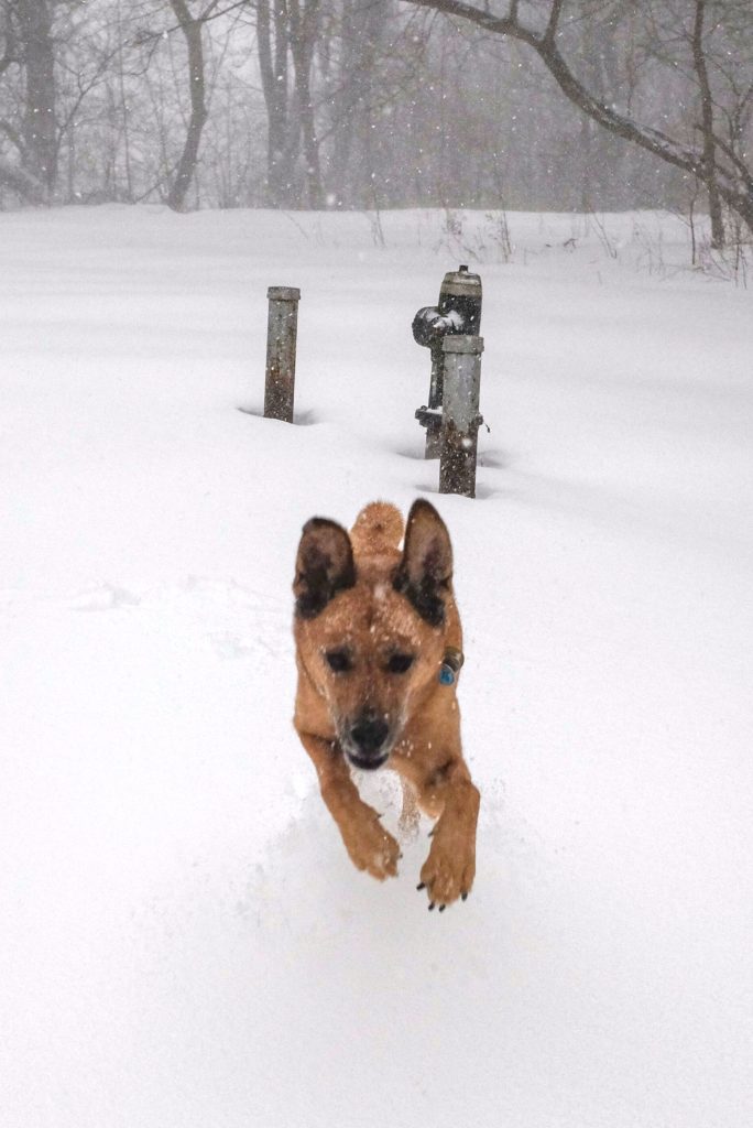 That took more than a year. We learned his early-warning sign: looking around nervously at, and snapping at, flies that weren’t actually in the room. (Really existing flies also made him anxious, I think because he associated them with the anxiety that accompanied the imaginary ones.) Twice he had a seizure while off leash in Prospect Park, and before I could grab his collar, as soon as he stopped twirling, he bolted—out of the park. I chuffed behind as in a dream where you’re running as fast as you can but don’t seem to be going anywhere. He crossed two busy roads alone, at top speed. By the time I got to our stoop, Peter, who had heard him howling downstairs, was letting him in. For more than a year after the second seizure in the park, all his walks were on leash. He was still able to run a little thanks to a really long training leash, and I brought a tennis ball that he jumped for when I tossed it, as we walked. I never measured, but he seemed to be able to jump higher than six feet with ease. Because he was restricted to the leash, he missed most of the developmental window for play with other dogs. In his whole life, there were only a handful of dogs he felt comfortable enough to play with.