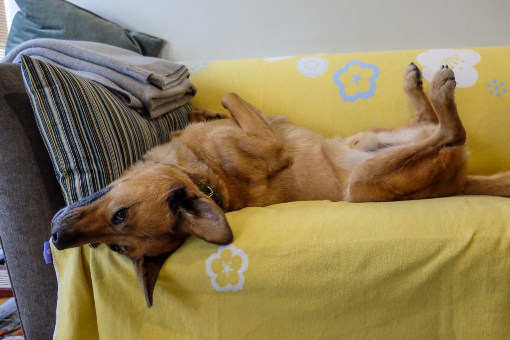 Little Toughie was one of our nicknames for him his first year, because he walked like a palooka and for months he seemed to accept room, board, and toys from us without feeling obliged to grant us any special recognition in return, or even much eye contact. That changed abruptly after we boarded him at a free-run kennel upstate while on a trip. We got him back covered in bite wounds. From then on, whenever we came home, he wanted to kiss our ears and jump up on the couch beside us and snuggle. Peter came to call this “couch time.” (We never boarded him at a kennel again.)