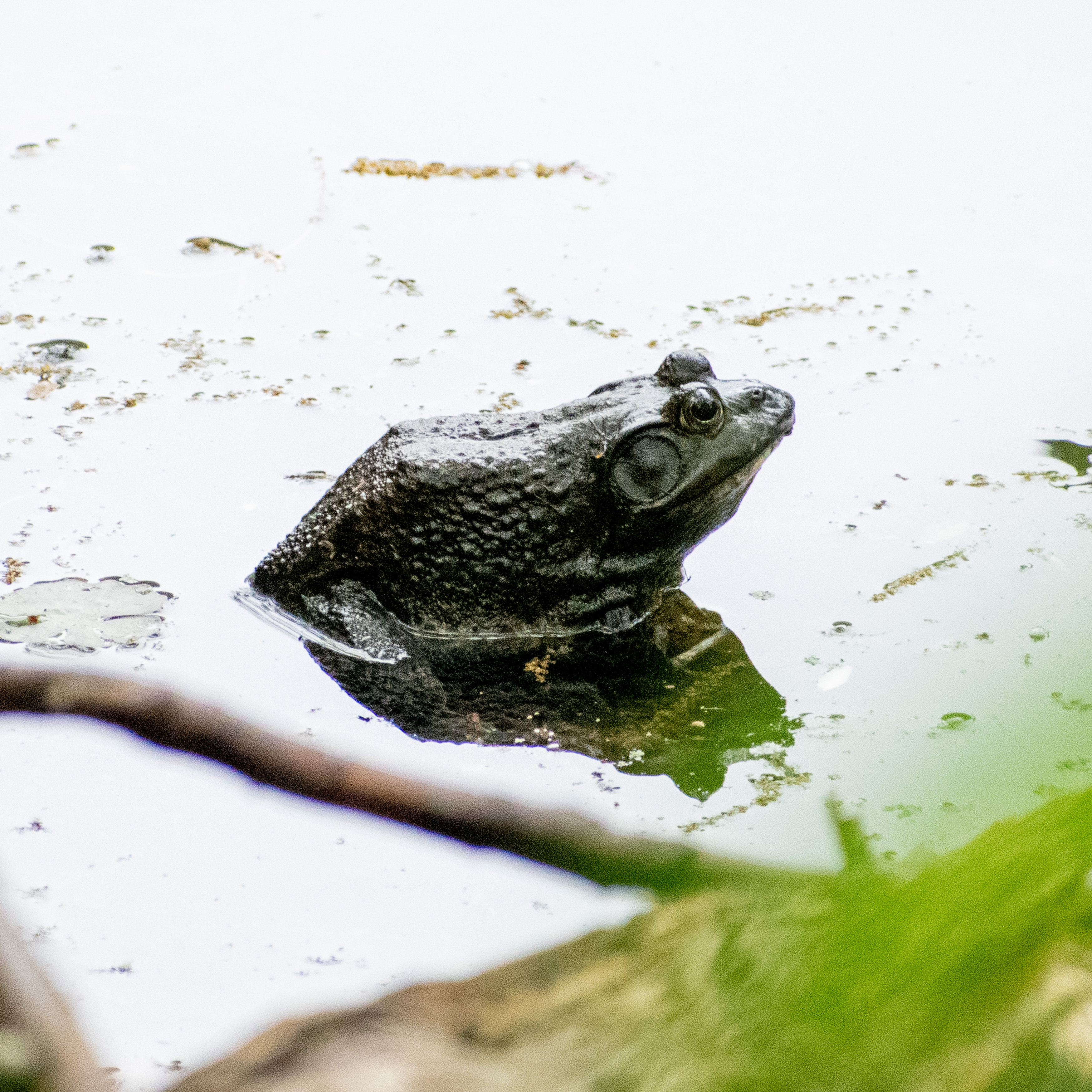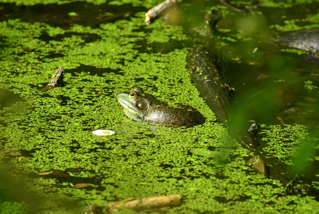 In this morning’s sweltering heat, Toby needed the brace under his rear legs (he’s losing his nerves’ connection to them, painlessly but untreatably) and couldn’t walk very far, so I had him sit in the shade just off the path, hitched to a fence post, while I walked down to the edge of the Lullwater and photographed black-crowned night herons. There were two this morning, hunting in their immobile way from separate logs. I photographed one of them looking quizzical, but it didn’t seem as though either was going to strike any time soon, so I decided it was a dud of a morning, took a sour photograph of a beer bottle poking up Excalibur-like from the toxic green algae (not pictured), and then fetching Toby, headed down the sidewalk toward home. Only to find the way blocked, by park workers doing some kind of construction. Runners were ignoring the workers’ instructions not to pass through, but defiance wasn’t possible if one was half-carrying a hobbling dog, so we turned back. I decided to take the check as a sign to try again with the herons. After parking Toby again in his spot, I crouched by the water’s edge and waited. Nothing happened. And then more nothing. And then suddenly something large thrashed terrifyingly in the water right in front of me and when the thrashing abruptly ceased, a gigantic frog was sitting on a log a few feet away.