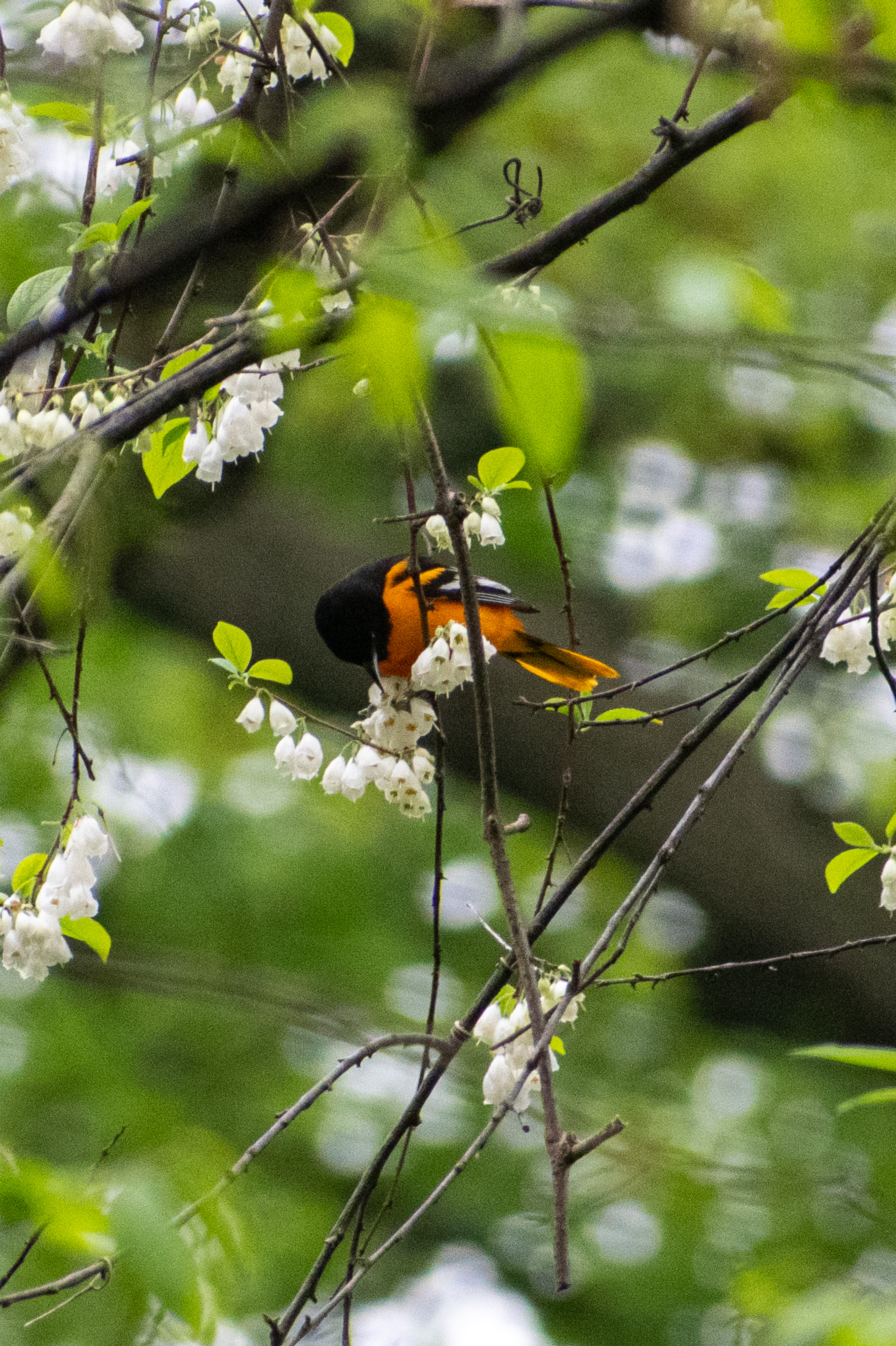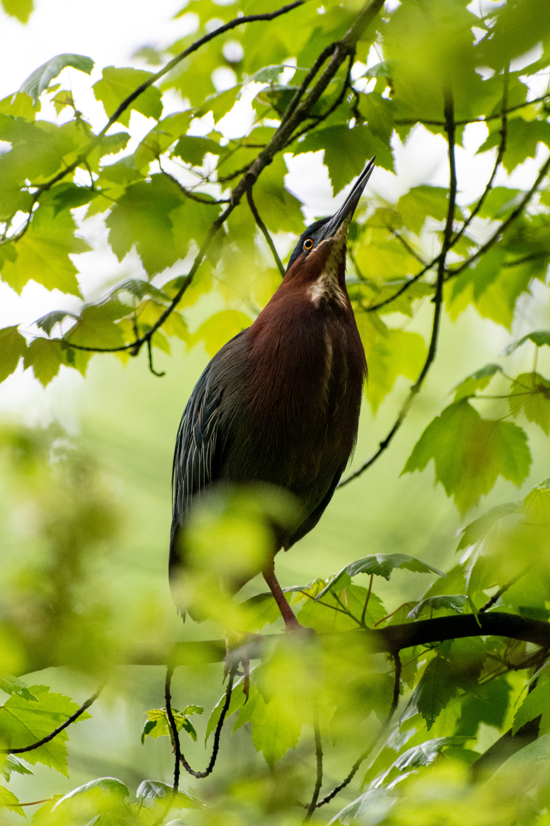 He flew with it into a tree across the water, to swallow it at his leisure. I stayed a little longer, because none of my photos of his triumph were altogether right—the above is the only one more or less in focus—and I sensed that the older heron wanted his innings, too. A few minutes later, he arched his neck and then struck—but he whiffed, and so my photo is of his ruffled rump at the indecisive moment.
